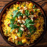 A spicy twist on traditional poha, topped with savory usal and garnished to perfection.